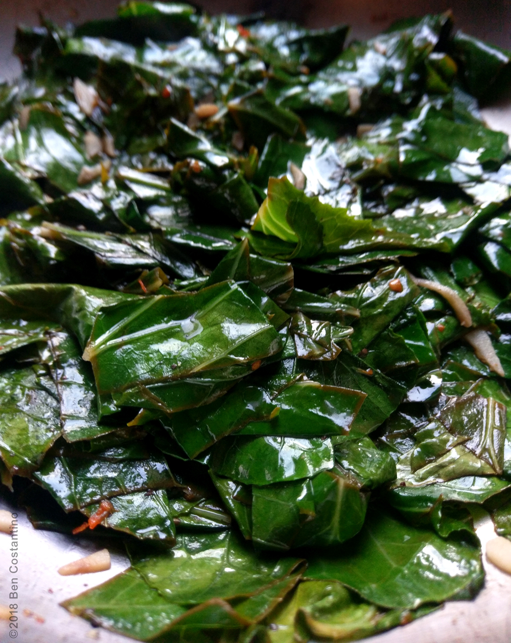 Garden salad with homegrown kale, yellow cherry tomatoes, Thai basil, Shishito peppers, and a vinaigrette laced with Tabasco peppers.