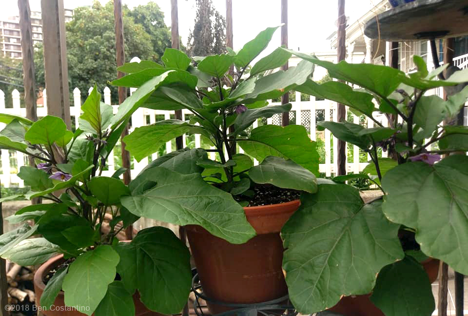 Typically you should grow baby eggplants in at least 3-gallon containers. These 9-inch clay pots were ultimately too small.