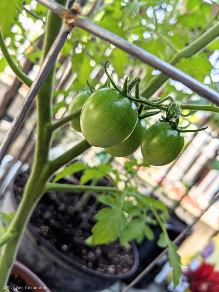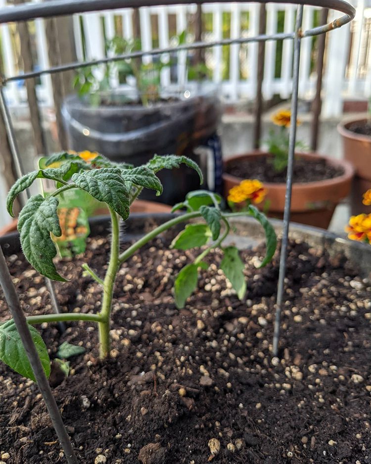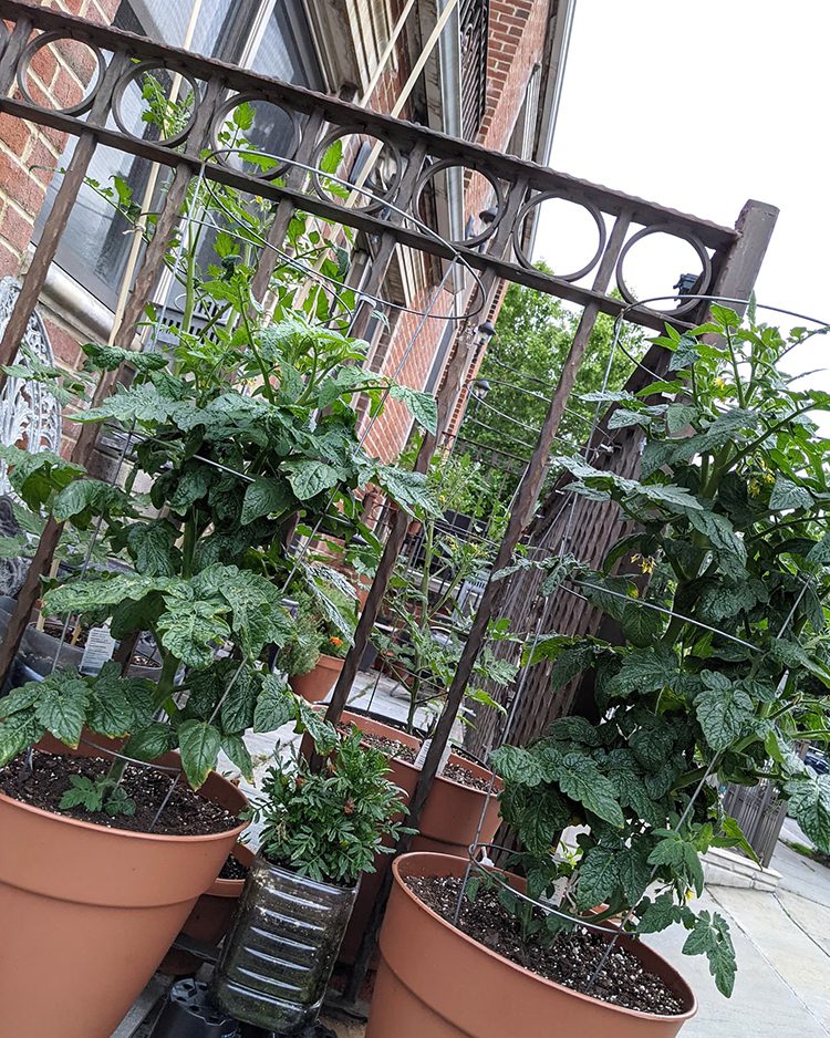 A huge benefit of container gardening is that you can place your plants to areas that receive the most sunlight. Moving just a foot or so can make all the difference. These tomatoes were moved outside the railing edge to capture an extra hour of sunlight in the mornings.