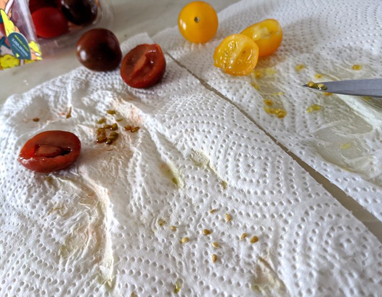 Extracting seeds from a brand of heirloom cherry tomatoes. Dried them on paper towels.