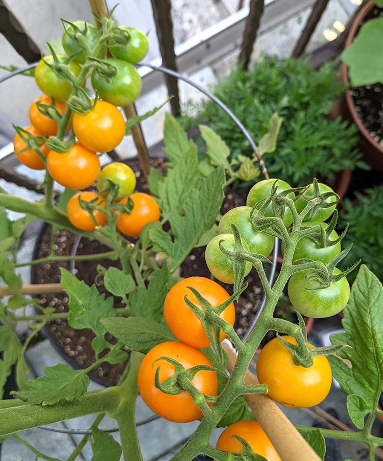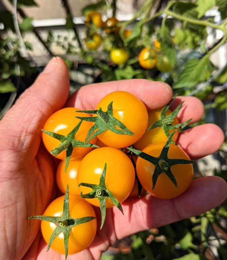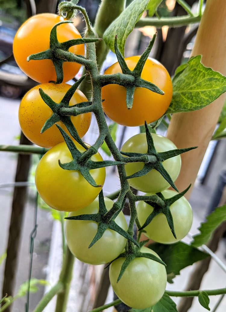 Growing yellow cherry tomatoes. Always wondering why they’re called “yellow” when they are clearly orange. Hmmmm.