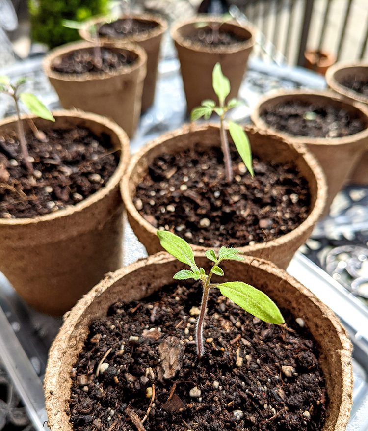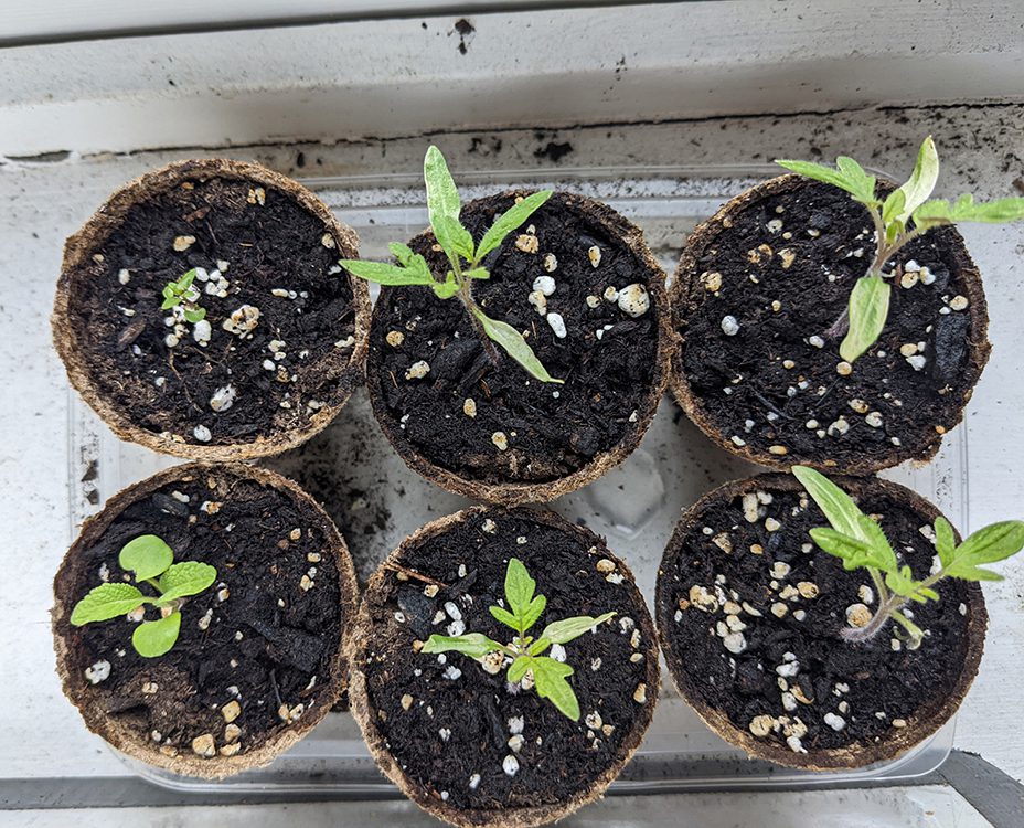 Summer container gardening in 2022 began by planting seeds in my window sill in early March,; (clockwise from upper left) Thyme, 4 Heirloom tomato plants, and sage.