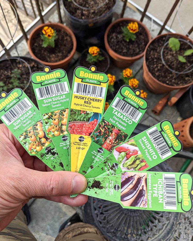 When buying seedlings for container gardening, consider theses smaller crops like cherry tomatoes, Tabasco peppers, Shishito peppers, and Ichiban (Japanese) eggplants and use 3 or 5-gallon containers.