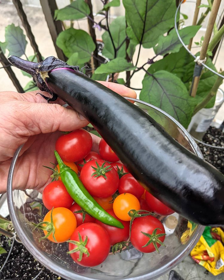 Ichiban Japanese eggplants, Sungold cherry tomatoes, Husky Red cherry tomatoes