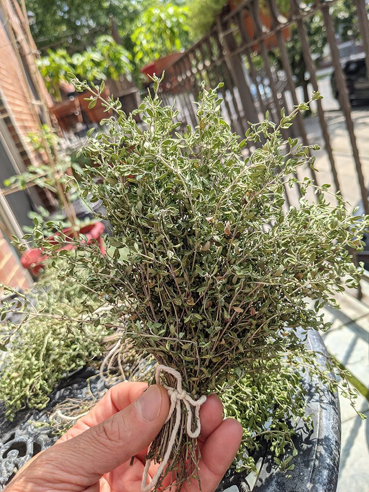 Thyme is a hearty herb whose flavor intensifies from being dried. Harvest and tie it in bundles, then store it dried in a glass jars for future use in recipes.