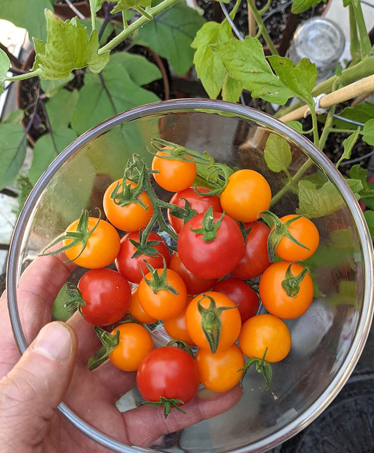 Cherry tomatoes are my most recommended crop for container gardening. Sungolds are extremely sweet, while these Husky Reds not so much.