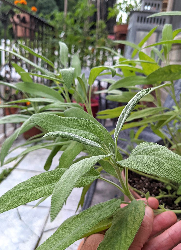I also managed to find a sage seedling somewhere, so it got me started with growing herbs. Sage frequently looks not-so-good in grocery stores and it grows super fast, so it’s perfect for container gardening at home.