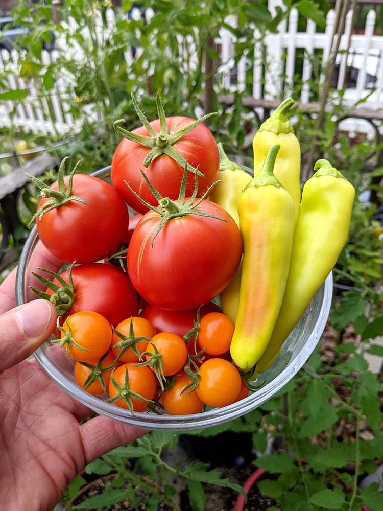 Sungold cherry tomatoes, banana peppers, Tabasco peppers, thyme, sage, eggplant, Shishito peppers. Heirloom tomatoes