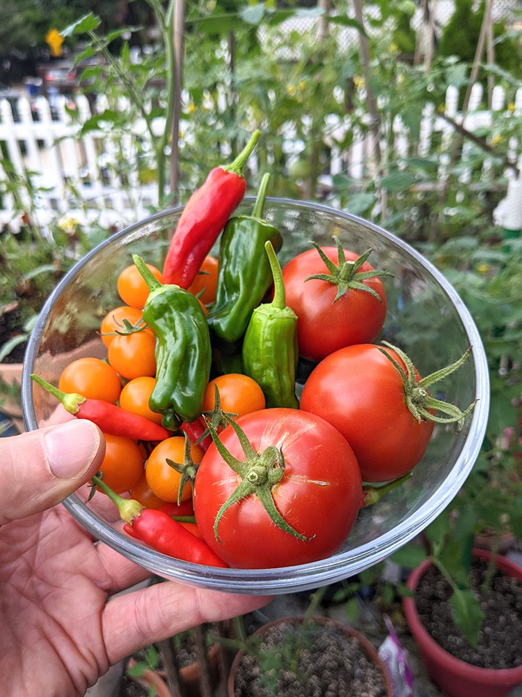 Sungold cherry tomatoes, Tabasco peppers, Shishito peppers, kale, Thai basil