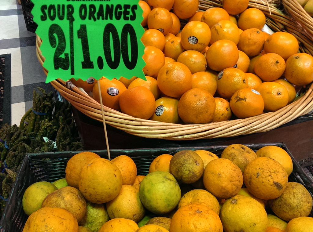 Also referred to as “Seville” orange, sour oranges are often overlooked due to their unsightly appearance. They range in size, have a more bumpy texture, usually marked with brown spots, and don’t appear very appetizing in general. You need not worry because these are not meant to be eaten raw as a snack like a typical orange. Instead, the juice is extracted and used in marinades. Because the juice content of each can vary quite a bit; it is difficult to know exactly how many you may need to purchase for your recipe. So, selecting sour oranges is a bit of a lottery. When gently squeezed they should be a little soft.