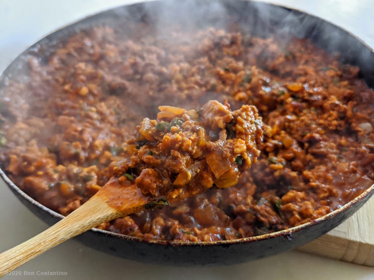 - Add the ground beef and turkey, then break it up. Stir in the tomato sauce and cook until the beef is browned.